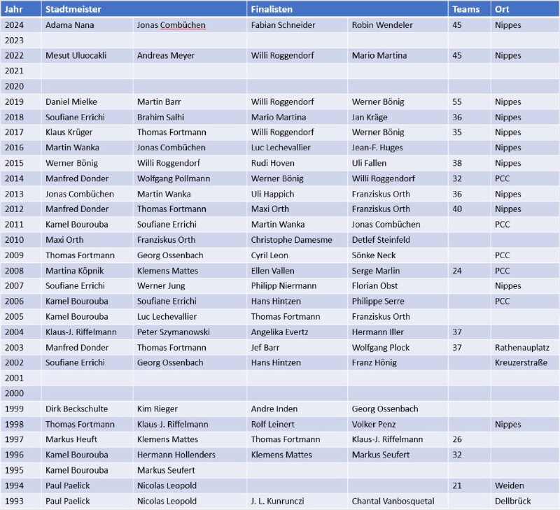 Kölner Stadtmeisterschaften19.01.2025Hier findet ihr alle bekannten Informationen zu den Kölner Stadtmeisterschaften ab dem Jahr 1993 bis heute! Habt ihr weitere Infos immer gerne an uns herantragen, dann vervollständigen wir die Liste gerne!