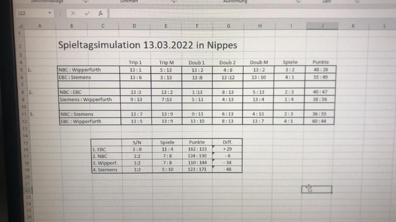 Die Devise war klar: Testen, testen, testen - ohne Angst vor Niederlagen. Die Nippes 2 Mannschaft (Wolfgang Pollmann, Uli Hapich, Antonio Gaita, Pedro Wagner, Jürgen Berke, Christoph Pohlenz, Corinna Heimburger, Silke Deutsch, Ahmad Saie, Franz Hönig und Bruno Delgado Dominguez) wurden wild durchgemischt und versuchten, das Beste daraus zu machen. Letztlich hat es sogar zu einem Sieg (über Wipperfürth) gereicht.