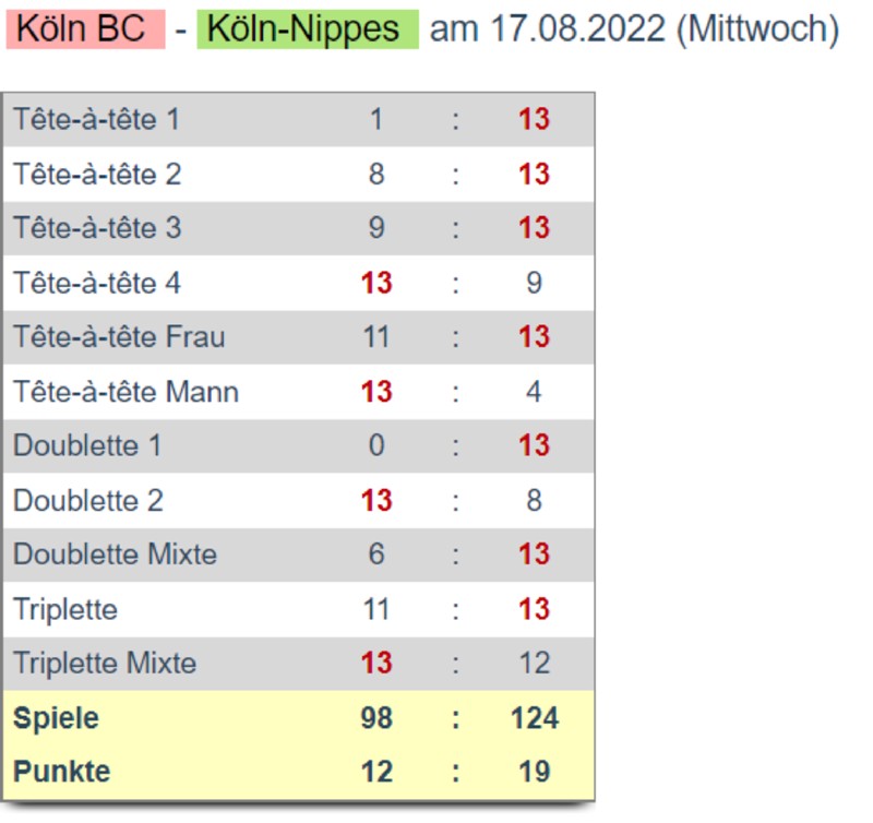 In der Tête à Tête Runde konnte der Nippeser Boule Club 4 von den 6 Spielen für sich entscheiden und damit schon einmal einen leichten Vorsprung herausholen.