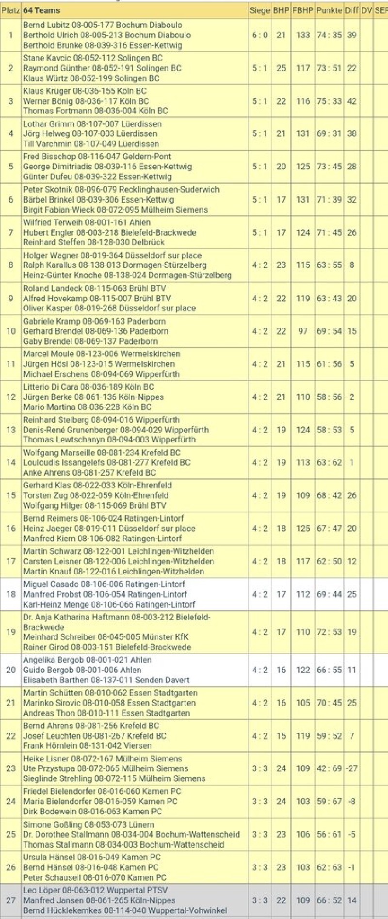 Am Ende holte Jürgen Berke mit seinem Team 4:2 Siege und damit das Ticket zur DM. Nach ganz starken Start von Manfred mit 3:0, verloren sie das 4. Spiel mit 10:11 und konnten auch danach keinen Sieg mehr holen. Auch das 6. Spiel geht unglücklich 12:13 aus. Damit verpassen sie vorerst die Deutsche Meisterschaft, stehen aber als 1. Nachrückplatz fest.