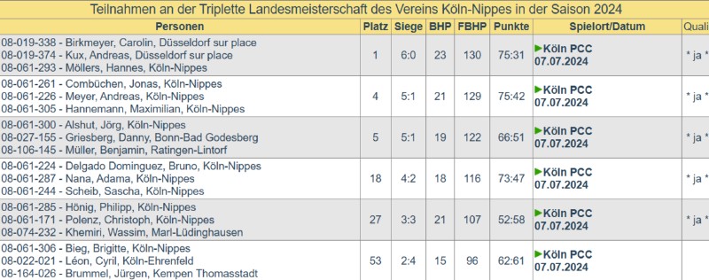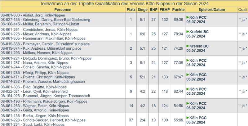 Es waren wieder zahlreiche Nippeser Spieler/innen am Start. Hier die Ergebnisse der Quali am Samstag:
