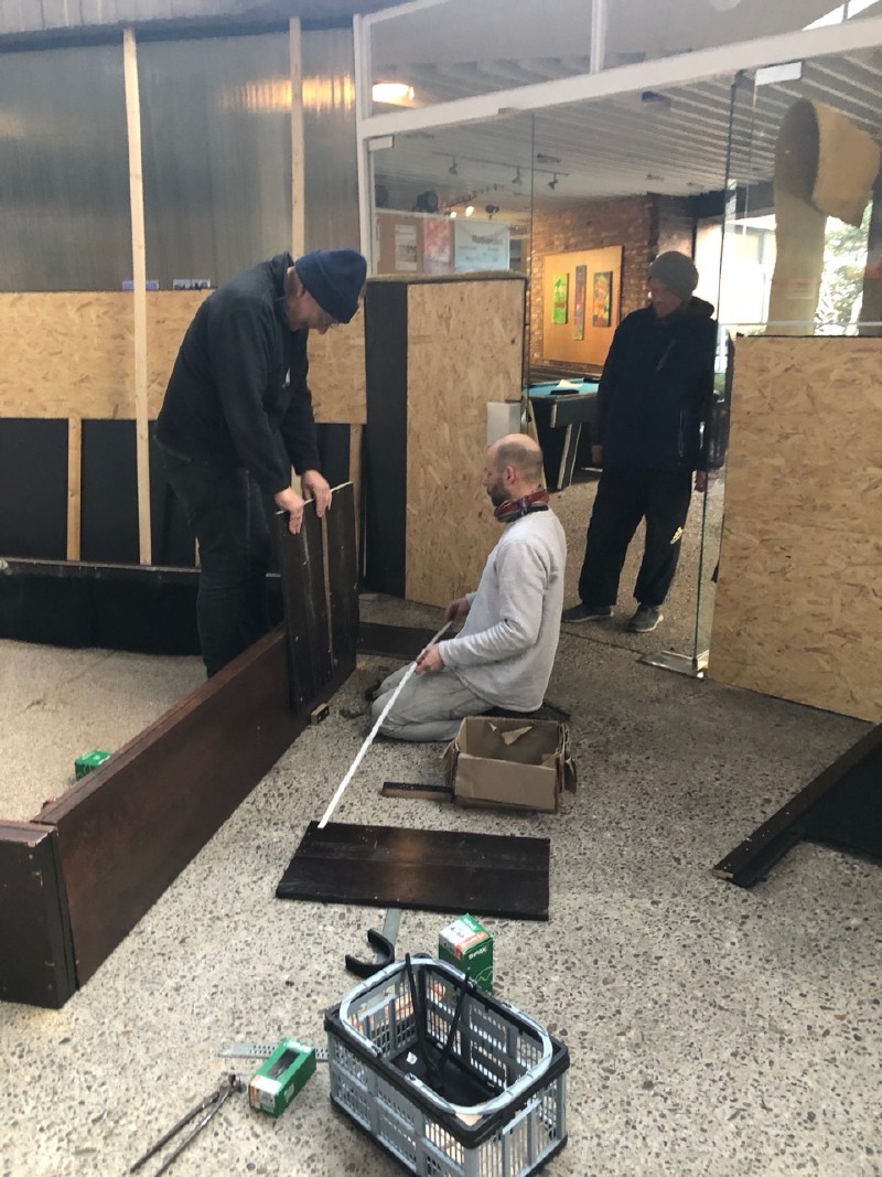 Die Pfarrerin Reinhild Widdig lud uns zu einem Ortstermin ein, um auszuloten, ob das geht. Und siehe da: Es funktioniert - mit ein paar Kompromissen. Damit die Orgel nicht einstaubt, spielen nicht auf dem üblichen Kies-/Split-Gemisch, sondern auf speziell entwickelten Boulematten, die zum Teil schon bei Kim Rieger in seinem Restaurant „Hardy Kugel“ in der Südstadt zum Einsatz kamen. Die drei Meter hohen Glaswände rund um die Spielflächen schützen wir durch eine zweite Wand aus Spanplatten. Ein hoher Rahmen um jedes Spielfeld sorgt dafür, dass keine Kugeln über die Bande springen und Schäden am Altar oder der Orgel anrichten. Das Konzept überzeugte auch das Presbyterium. Kurz vor Weihnachten beschloss es einstimmig, uns - dem Nippeser Boule Club - ihr allerheiligstes bis zum 31. März anzuvertrauen.